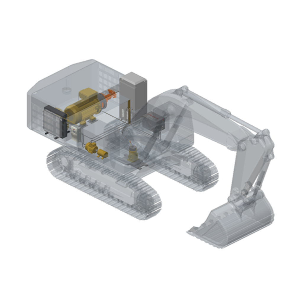 Concepts were developed for Komatsu PC300 and Liebherr R996 excavators, converting them to grid-connected electric drive systems. These solutions enable up to 50% reduction in energy cost and 30% reduction in maintenance, making them ideal for mines, indoor operations and low-noise zones. High-voltage cable reeler systems were also engineered as part of the solution.