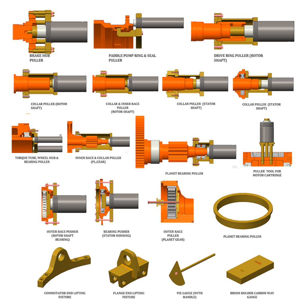 A wide range of service tools and fixtures were engineered and manufactured, including engine lifting spreader bars, pump lifting tools, wheel hub and bearing pullers, planet gear tools, motor cartridge tools, and precision gauges supporting heavy equipment assembly and maintenance.